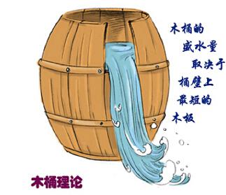 该理论由美国管理学家彼得提出:盛水的木桶是由许多块木板箍成的,盛水量也是由这些木板共同决定的。若其中一块木板很短,则盛水量就被短板所限制。这块短板就成了木桶盛水量的“限制因素”。