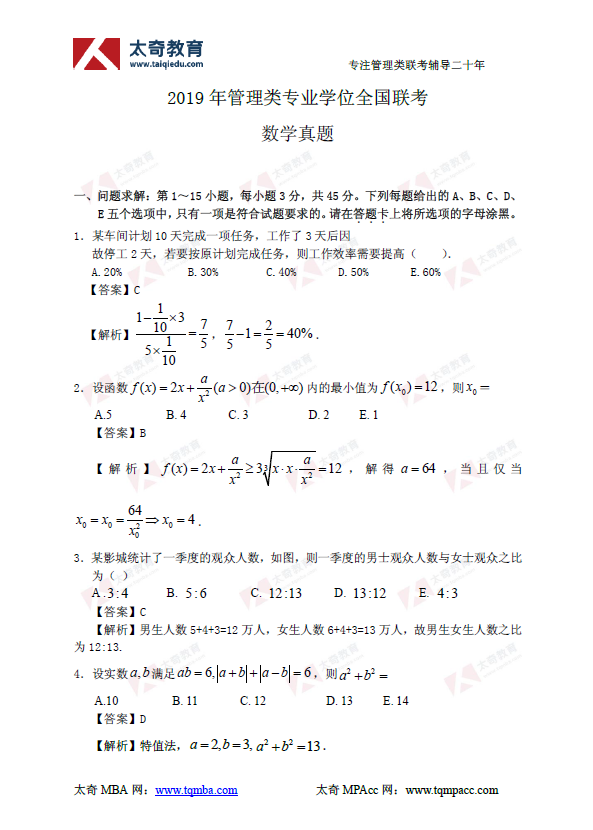 2019年MBA/MPAcc管理类联考数学真题及答案