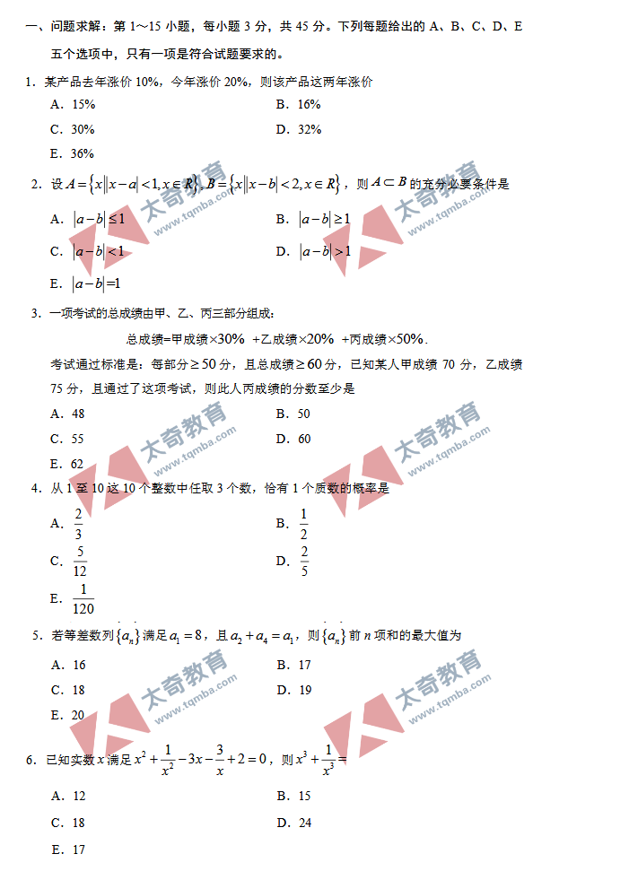 2020年管理类联考考试试题及答案公布,内容整理如下,供参考。【太奇教育名师管理类联考真题解析及在线估分】12月21日19:00准时在线直播>>真题解析、考情分析、在线估分、复试前瞻、调剂攻略,敬请关注!太奇教育小编也祝同学们考得好成绩。