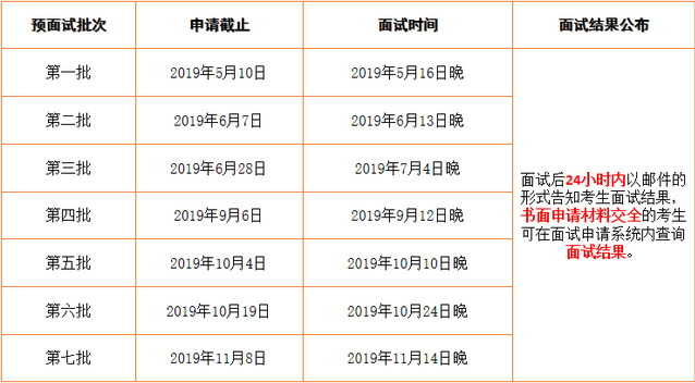 面试安排批次依照考生递交书面材料的顺序先到者先评估,先安排预面试。预面试内容:综合能力面试(个面)、英语能力测试(6到8人一组面试)。面试后我校会在系统中告知考生的面试成绩,即录取分数线类别(A线B线C线)。报考我校一志愿的考生成绩两年有效,次年可继续申请。
