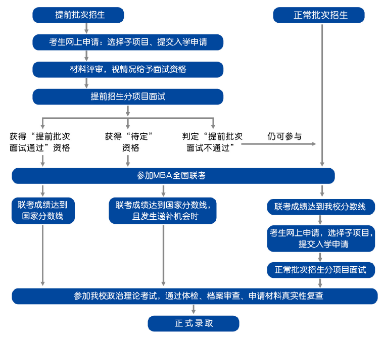 4.“MBA提前批次招生”将安排于2020年6月至10月进行,参加提前批次招生的考生需在联考报名前的指定期间内在线提交申请材料,经过材料评审,择优给予面试资格;经过面试环节择优给予综合素质优秀的考生“提前批次面试通过”资格;原则上,该类考生参加全国联考成绩达到国家线、符合复试要求即可附条件录取。(以当年国家政策和学校要求为准)