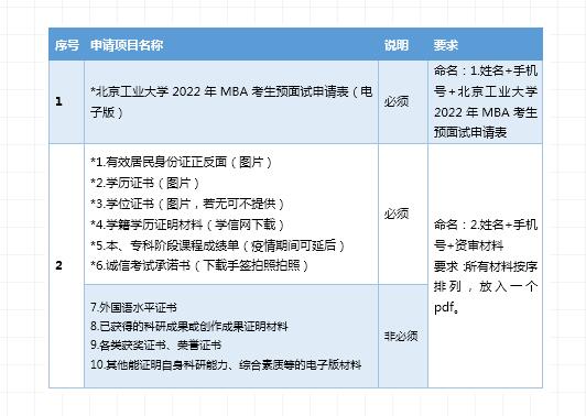 2.申请材料:请将《北京工业大学2022年MBA考生预面试申请表》和资审材料放入同一文件夹(见原文链接附件),压缩打包后发送,邮件名称和文件夹名称为“第x批2022MBA预面试+姓名+手机号”。
