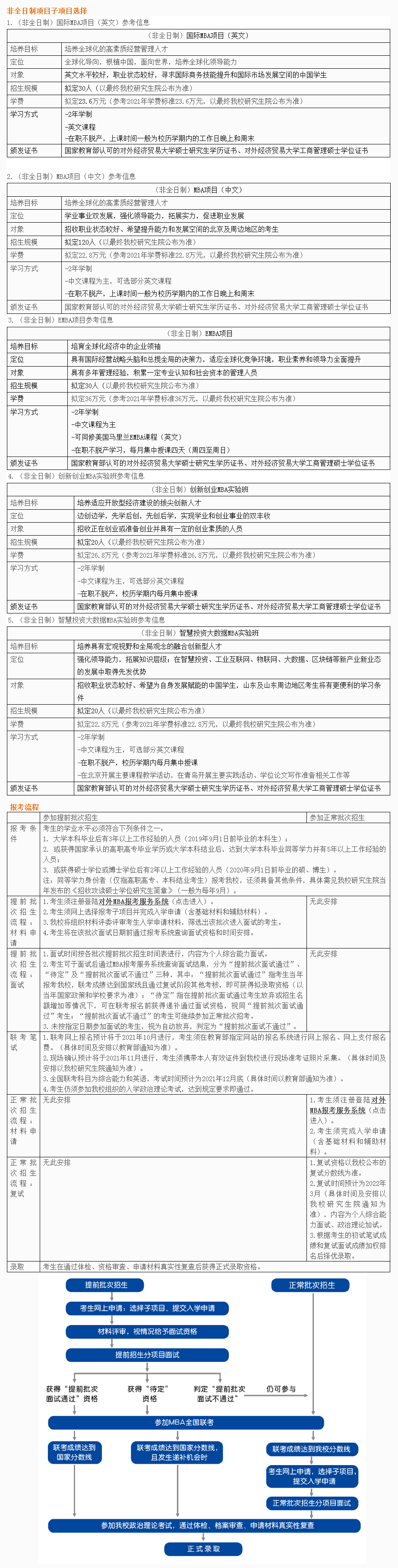 1.招生类别分为五个子项目,分别为:①(非全日制)国际MBA项目(英文)、②(非全日制)MBA项目(中文)、③(非全日制)EMBA项目、④(非全日制)创新创业MBA实验班、⑤(非全日制)智慧投资大数据MBA实验班。各子项目设置独立的招生标准,分别依序招生,在简历评审、面试选拔等环节各自排序,差额优选。申请任意子项目并获得面试通过资格后,原则上不可做任何项目调整。: