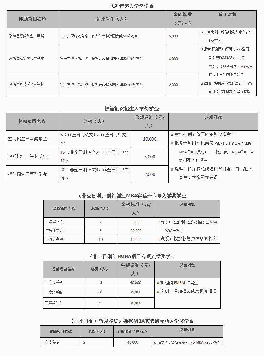 设立五种类别入学奖学金,以资鼓励报考我校MBA/EMBA项目、全国联考初试分数成绩优秀、提前批次招生面试表现出色的考生。