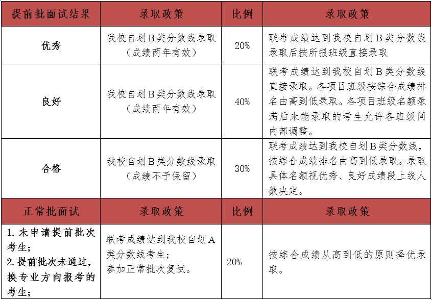 2.提前面试中获得有条件预录取(优秀、良好、合格)资格的考生联考成绩过我校自划B类分数线且在档案和申请材料审查真实性通过后,按成绩对应录取政策录取;