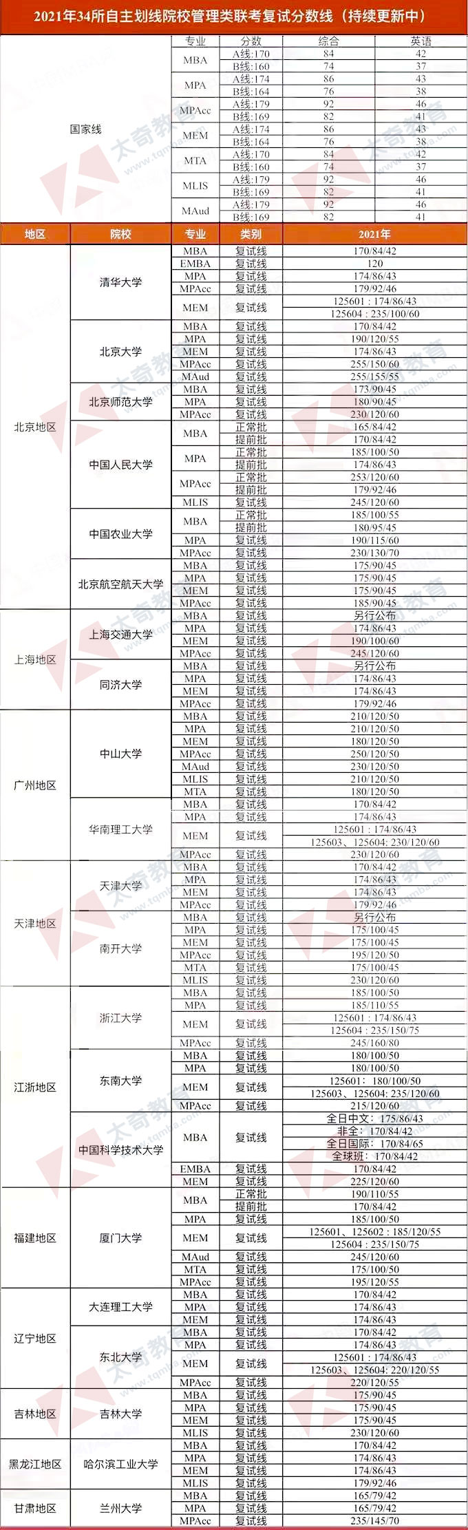 2021年国家线及34所自划线的各高校MBA复试基本分数线汇总,有需要的小伙伴快收藏!