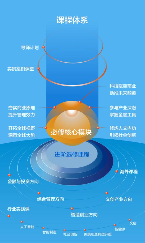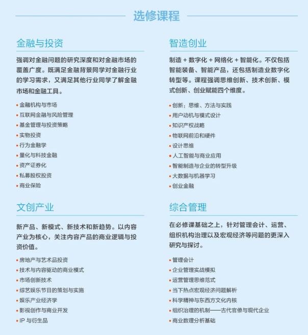 长江商学院MBA项目结合学院的差异化优势,在基础核心课程之外,还围绕金融与投资、智造创业、文创产业三个最具潜力的赛道以及综合管理方向, 开设了丰富的选修课程,并通过多样的行业实践课程使同学保持对行业前沿趋势的敏锐度,通过特色的海外课程提高同学的视野、实现资源跨界整合, 用多元的行业 讲座和实景案例课堂给学生提供更充实的学习体验。
